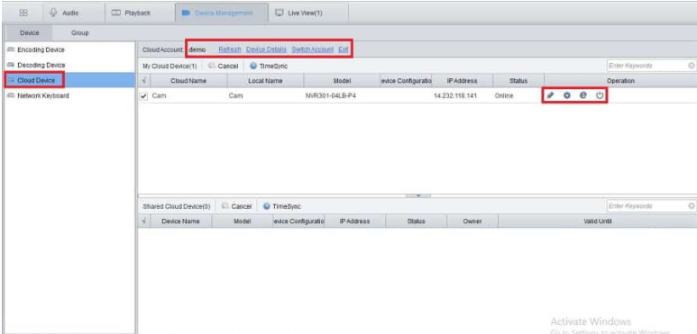 - Đăng nhập vào bằng tài khoản chứa thiết bị thì được như hình dưới với trạng thái ( Status – Online )